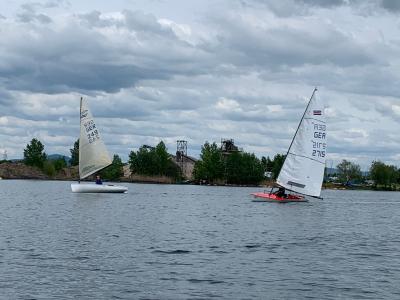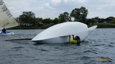 Auf Grund einer starken Regenbö kenterten noch kurz vor dem Start zwei Boote, darunter Katrin und Marie. Auch bei Linus und Felix war es spannend, als zwischen den Läufen noch schnell ein gerissenes Segel getauscht werden musste.