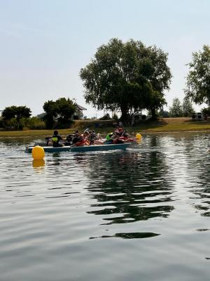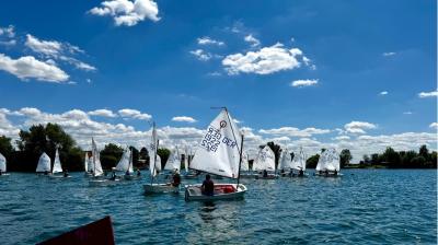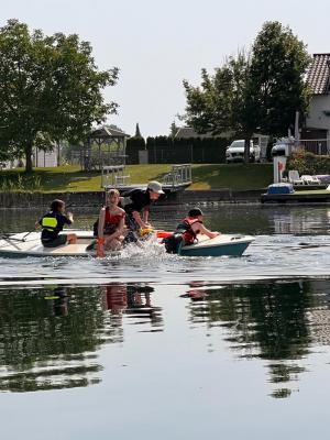 Am Sonntag zeigte sich der Baggersee leider erneut spiegelglatt. Das Wettfahrtteam des SV Biblis zeigte sich jedoch einfallsreich und richtete eine Paddelregatta aus. Dafür wurden drei Laser mit Schwert und Ruder bestückt und die 12 Teilnehmenden darauf verteilt. Mit ihren Praddeln aus den Optis glitten die Boote über den See und fuhren den ausgelegten Kurs ab.