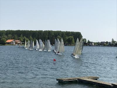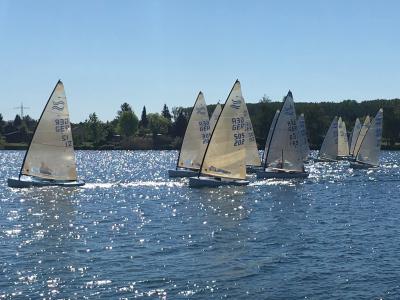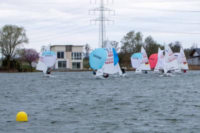 Als wir um kurz vor 13 Uhr auf unsere Boote sprangen, sah der See noch ziemlich glatt aus. Unser Wettfahrtleiter Marco hatte die Tonnen auf dem kleinen See ausgelegt und bis zum Start kam tatsächlich etwas Wind auf. Da im ersten Lauf wegen des unsteten und drehenden Windes kein richtiger Downwind-Kurs möglich war, wurde auf dem großen See ein neuer Kurs betonnt und wir konnten einen schönen 2.Lauf starten, der dann in einer großen Flaute endete. Im Schneckentempo krochen wir in Richtung Ziel. Kaum zu glauben, dass kurz vor dem Start zum 3.Lauf urplötzlich Wind aufkam und wir die Regatta gut zu Ende segeln konnten.