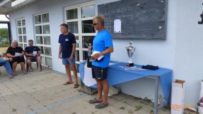 Nach dem Abschluss des dritten Laufs wurden die Segelnden mit Steaks und Würstchen vom Grill versorgt, danach ehrten Marco (Wettfahrleiter) und Conny (Leiterin Sportausschuss) die Segler bei der Siegerehrung und verteilten kleine Erinnerungspreise, sowie Pokale für die Kinder.
