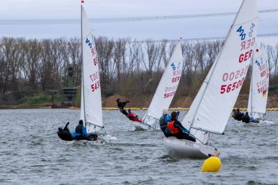 Der Sonntag zeigte sich von seiner sonnigen, frühlingshaften Seite und schon morgens war klar, dass der Wind für die Regatta ideale Bedingungen bot. Das Wettfahrteam bereitete den Kurs für den zweiten Lauf auf dem östlichen See vor, der erfolgreich durchgeführt wurde. Später drehte der Wind, sodass der Wettfahrleiter Marco Colombo entschied, die Tonnen auf den Westsee zu verlegen. Ein spannender 3.Lauf bei 2-3 Beaufort und leicht böigen Bedingungen musste leider kurz vor dem Ende abgebrochen werden und schon wurde es fast zeitknapp, noch vor 13 Uhr den 4.Lauf zu starten. Bei den insgesamt 3 gewerteten Wettfahrten erreichten Joline & Pia knapp – mit einem Punkt Vorsprung - vor den punktgleichen Teams Jacob & Paul und Nicolo & Marcello die ersten Plätze. Joris und Tim vom SV Biblis segelten auf den 14.Platz.