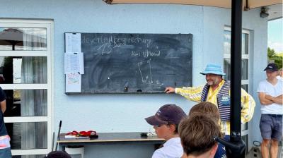 Wie es sich für ein Segelschiff gehört brauchte der Opti natürlich noch einen Namen. Dazu konnten die Kinder und Jugendlichen Vorschläge bei unserem Jugendwart Frits einreichen und im Anschluss für ihren Favoriten abstimmen. Unter den Vorschlägen lagen "Fritsi", "Piet" und "Windking" weit vorne. Endgültig gewonnen hat dann aber ein Name, der besser nicht zu Biblis passen könnte... Gemeinsam mit der jungen Seglerin des neuen Optis enthüllte der stellv. Vorsitzende Fabio den Namen, der stolz am Bug des Opti prangt: "Gurke"