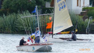 Unser Verein freute sich sehr, dass so viele Gäste, auch von weither kamen, z.B. aus Frankfurt an der Oder und dem Ruhrgebiet. Vom Segelclub Dümmer reiste Juliane Barthel an, Aero7 Weltmeisterin der Frauen von 2023, und segelte in Biblis auf Platz 1, dicht gefolgt von Marcus Walter und Gert Keppler vom Dreieich Segelclub Langen. Aufgrund der 13 Teilnehmer konnte eine Ranglistenwertung für Aero7 erstellt werden, bei der auch die Aero6 mitsegelten, um die Mindestanzahl von 10 Seglern zu komplettieren. Auch eine Yardstickwertung wurde ermittelt, in der unsere Bibliser SeglerInnen auf folgende Plätze kamen: 5. Margaret Lynch, 6. Sebastian Karst, 10. Barbara Olbrich, 11. Claus Gabriel, 12. Clarissa Olbrich.