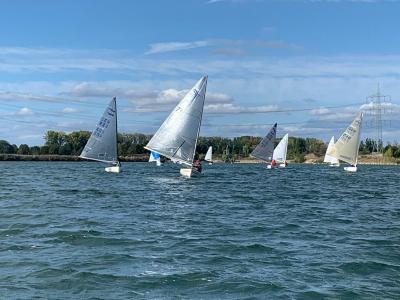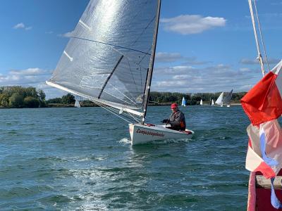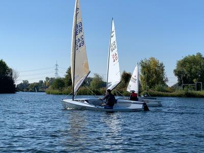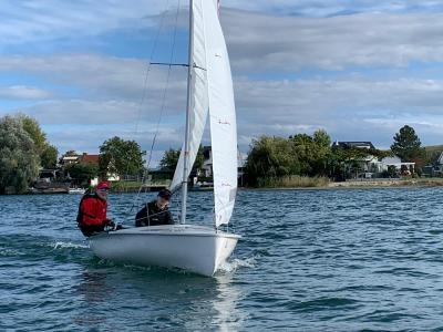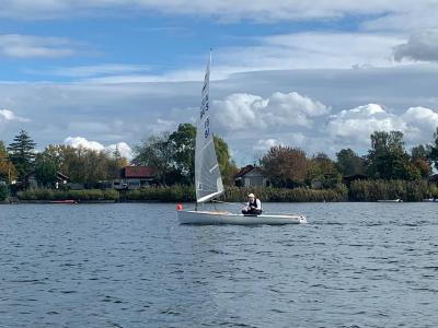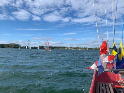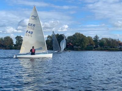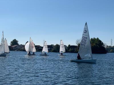 Die diesjährige "Goldener Herbst" Regatta machte ihrem Namen wieder alle Ehre. Besonders am Samstag waren die Temperaturen so mild, dass einige Segler im Shorty auf dem Wasser waren. Auch der Wind spielte mit und es konnten zwei Läufe am Samstag bei schönstem blau-weißen Himmel abgeschlossen werden. Die Wertung erfolgte wieder nach Yardstick, dadurch konnten sich Segler aller Bootsklassen miteinander messen. Von einem Korsar über zwei 420er bis hin zu (natürlich) Finn-Dinghy und sogar einem Opti waren insgesamt 13 Boote mit 18 Seglern auf dem Regatta Kurs.