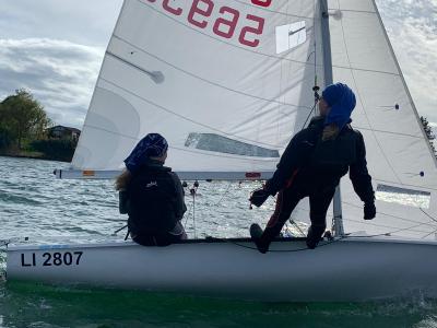 Der Sonntag zeigte sich von seiner sonnigen, frühlingshaften Seite und schon morgens war klar, dass der Wind für die Regatta ideale Bedingungen bot. Das Wettfahrteam bereitete den Kurs für den zweiten Lauf auf dem östlichen See vor, der erfolgreich durchgeführt wurde. Später drehte der Wind, sodass der Wettfahrleiter Marco Colombo entschied, die Tonnen auf den Westsee zu verlegen. Ein spannender 3.Lauf bei 2-3 Beaufort und leicht böigen Bedingungen musste leider kurz vor dem Ende abgebrochen werden und schon wurde es fast zeitknapp, noch vor 13 Uhr den 4.Lauf zu starten. Bei den insgesamt 3 gewerteten Wettfahrten erreichten Joline & Pia knapp – mit einem Punkt Vorsprung - vor den punktgleichen Teams Jacob & Paul und Nicolo & Marcello die ersten Plätze. Joris und Tim vom SV Biblis segelten auf den 14.Platz.