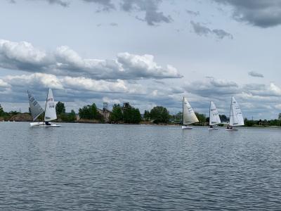 Als wir um kurz vor 13 Uhr auf unsere Boote sprangen, sah der See noch ziemlich glatt aus. Unser Wettfahrtleiter Marco hatte die Tonnen auf dem kleinen See ausgelegt und bis zum Start kam tatsächlich etwas Wind auf. Da im ersten Lauf wegen des unsteten und drehenden Windes kein richtiger Downwind-Kurs möglich war, wurde auf dem großen See ein neuer Kurs betonnt und wir konnten einen schönen 2.Lauf starten, der dann in einer großen Flaute endete. Im Schneckentempo krochen wir in Richtung Ziel. Kaum zu glauben, dass kurz vor dem Start zum 3.Lauf urplötzlich Wind aufkam und wir die Regatta gut zu Ende segeln konnten.