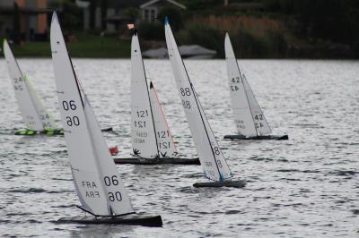 In einem Up and Down-Kurs wurden 6 Tonnen gelegt, die umfahren werden mussten. Auf beiden Seen wurden die Bojen geankert, damit je nach Wetterlage gewechselt werden kann. Ralf Kratz sorgte dafür, dass insgesamt 18 Wettfahrten in drei Gruppen ausgetragen werden konnten. Bei einem Leichtwind von zwei Beaufort war dies ein guter Schnitt. Der Musikalisch eingeleitete Countdown sorgte für Spannung beim Start der kleinen Renn-Segler. Schon gleich waren laute Protestrufe zu hören, die Teilnehmer wechselten oft die Position für eine bessere Sicht auf ihr Wettkampfgerät. Bis zur Siegerehrung am Sonntagnachmittag war es hochemotional und spannend. Die Scoring-Damen gaben dann bekannt: Der Favorit aus Chelmsford in England Graham Bantock siegte vor dem Deutschen Jürgen Peters und Nigel Winkley aus Bremen. Bantock gilt weltweit als Top-RC-Segler. Der neue internationale Deutsche Meister dominierte die Regatta bereits vom ersten Lauf an und belegte in 4 von 6 Läufen Platz Eins.